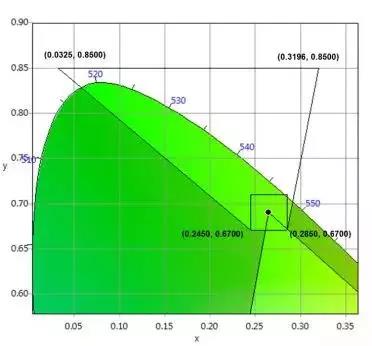 ▲图5:满足DCI色域(含误差)要求的LED绿光色坐标范围